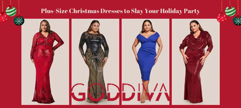 Праздничный lookbook платьев для полных женщин английского бренда Goddiva 2026 | |